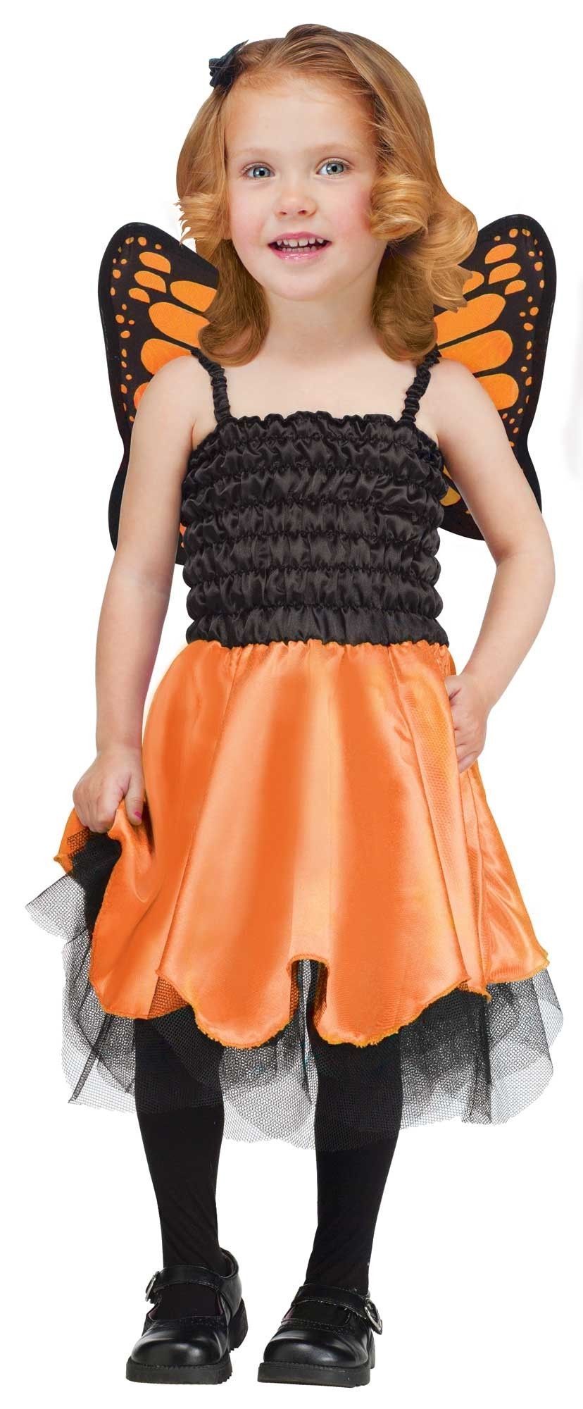 Детский костюм оранжевой Бабочки - это яркий костюм, включающий в себя платье до колен с оранжевой слегка расклешенной юбочкой и гофрированным топом. Платье на тонких бретельках. К нему также прилагаются яркие оранжевые крылья с черными узорами.