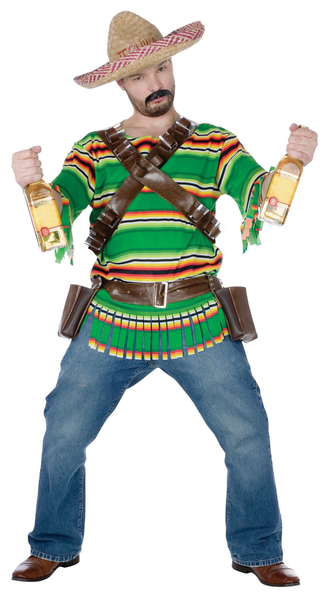 Костюм Мексиканца с текилой идеально подойдет для алкогольных вечеринок и маскарадов. В комплекте костюма имеется зеленая кофта с бахромой и яркими полосками, сомбреро. Также имеется пояс с двумя чехлами по бокам для бутылок, два патронташа, изготовленных из искусственной коричневой кожи и восемь специальных рюмочек.