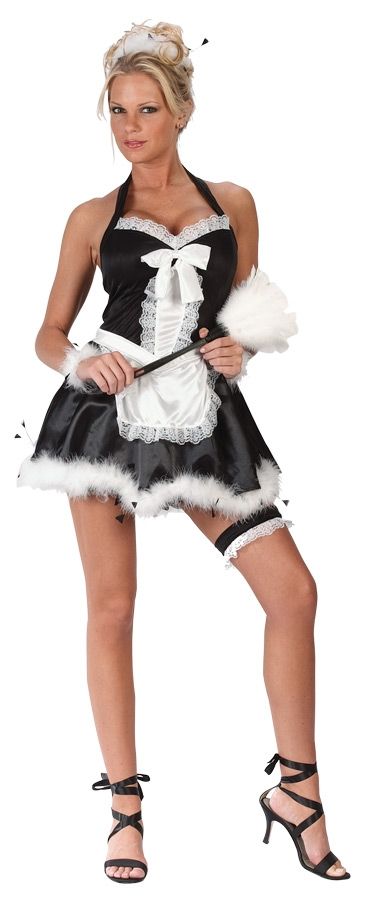Костюм интригующей горничной представляет собой черное мини платье с белым фартуком и рюшами. В комплекте идет головной убор, подвязка, манжеты и щеточка для уборки. Костюм подходит для ролевых игр. Устройте генеральную уборку холостяцкого жилища своего любимого в этом наряде, а он навсегда останется с вами.