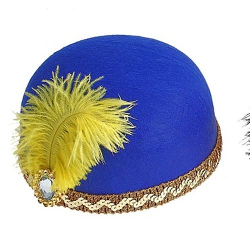 Синяя шляпка с пером выполнена в форме котелка. Шляпка украшена тесьмой и пушистым желтым перышком с искусственным камешком.