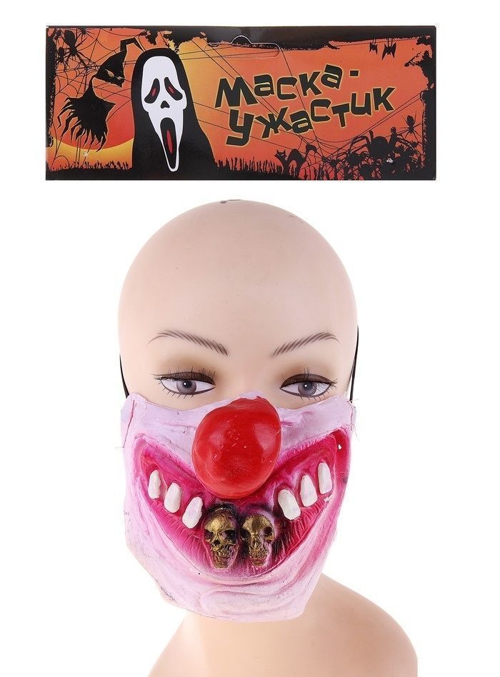 Маска клоуна с жуткой улыбкой и большим красным носом. Вместо двух передних зубов вставлены зубы в виде черепа, что делает маску еще более устрашающей. Маска изготовлена из латекса и имеет размер 20х13 см.