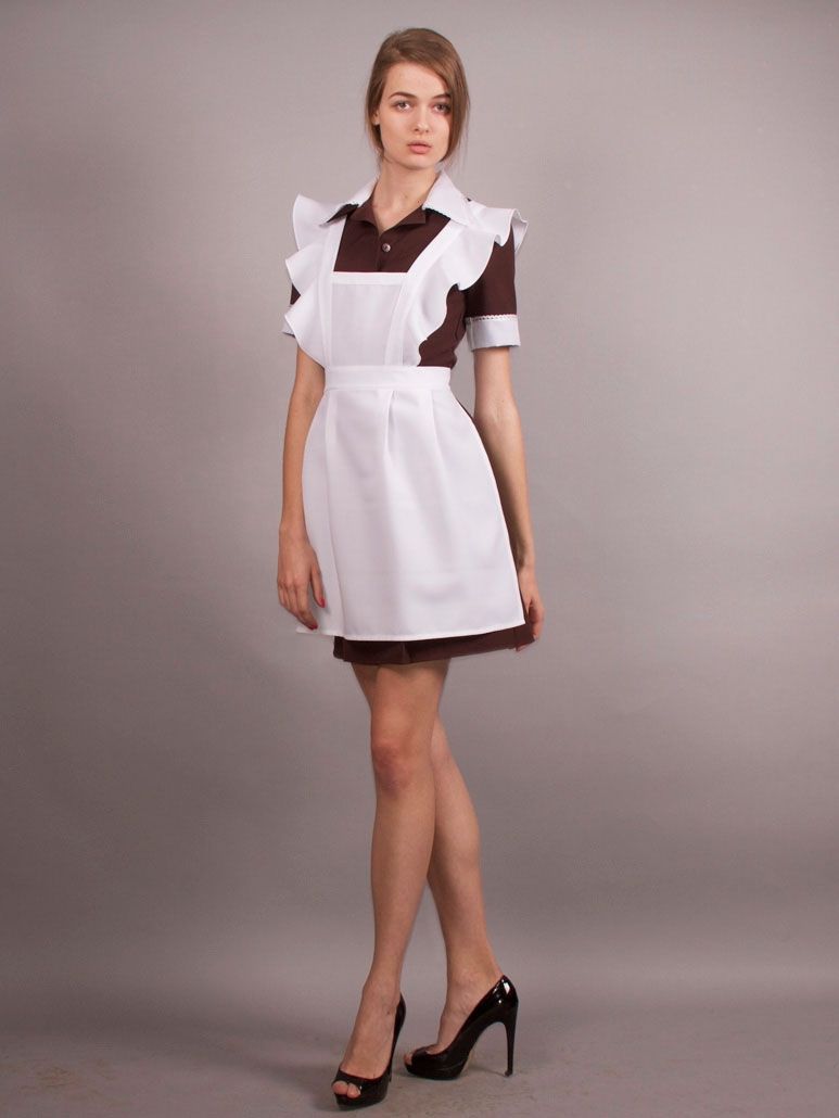 Форма советской школьницы СССР подростковая состоит из коричневого платья и белого фартука. Платье с заниженной талией, юбка с 2-мя складками спереди и сзади, лиф платья застегивается спереди на пуговицы, воротник отложной, накладные манжеты и воротник, которые входят в комплект. Рукав короткий. Белый фартук из габардина, крылышки воланом. Пояс завязывается сзади.