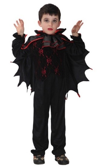 Детский костюм мрачного вампира станет отличным вариантом костюма на праздновании Хэллоуина. Костюм выполнен в черном цвете и включает в себя черные брюки, рубашку с рисунком в виде красных черепов с костями и плащ в форме крыльев летучей мыши.