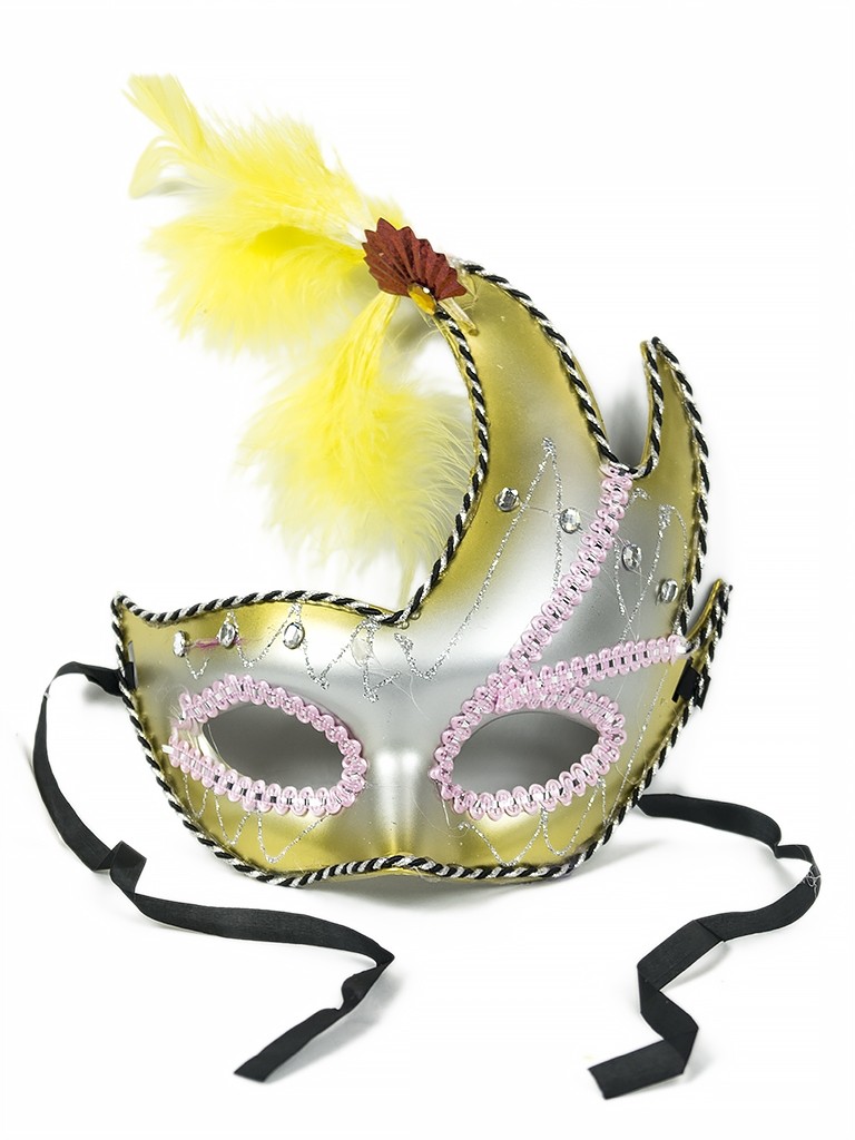 Желтая маска с асимметрией - серебристо-желтая маска с асимметричным узором, дополненная тесьмой розового цвета. Также ее украшают желтые легкие перышки.