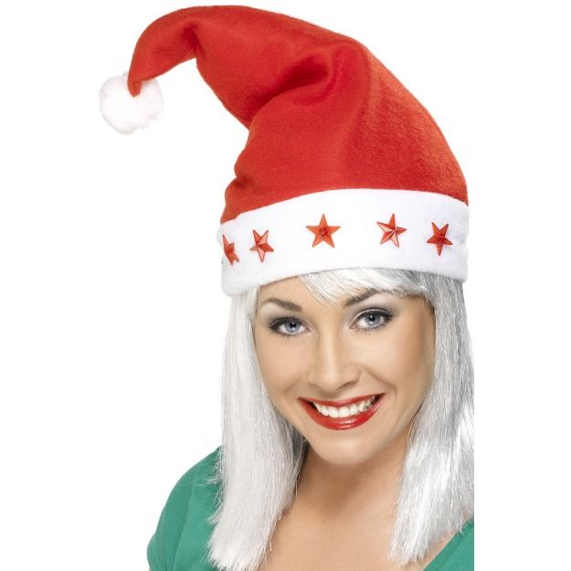 Женская шляпка Санты выполнена в красном цвете с белой полоской. На конце шляпки прикреплен белый помпон. Снизу на белой полоске расположены маленькие светящиеся красные звездочки, который будут ярко сиять в новогодней ночи.