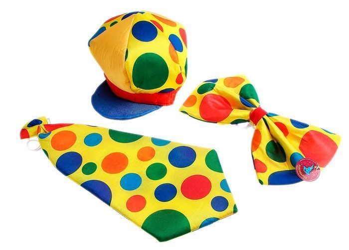 Набор клоуна состоит из фуражки, банта и галстука. Отличный выбор для полного завершения образа клоуна.