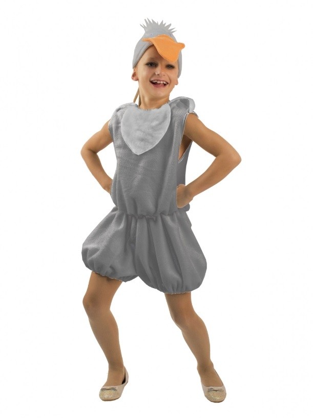 Костюм серого гусенка - флисовый костюм, выполненный в сером цвете. В комплект входит комбинезон с шортиками, а также шапочка-маска с оранжевым клювом.