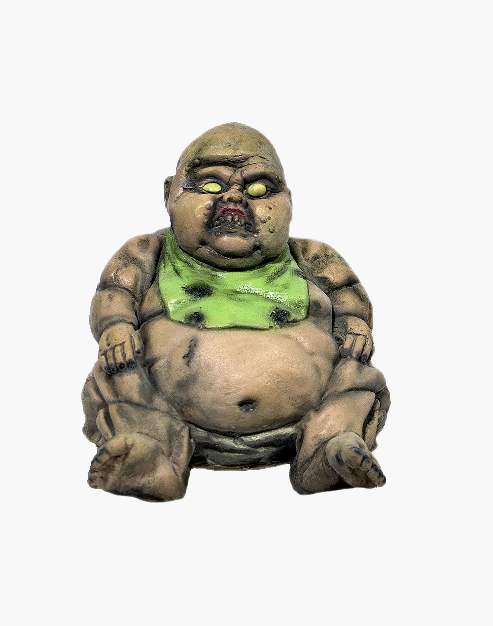 Декорация Грязный пупс в слюнявчике выполнена из латексного прочного материала и представляет собой сидящего толстого жуткого пупса с ссадинами и в зеленом грязном слюнявчике.