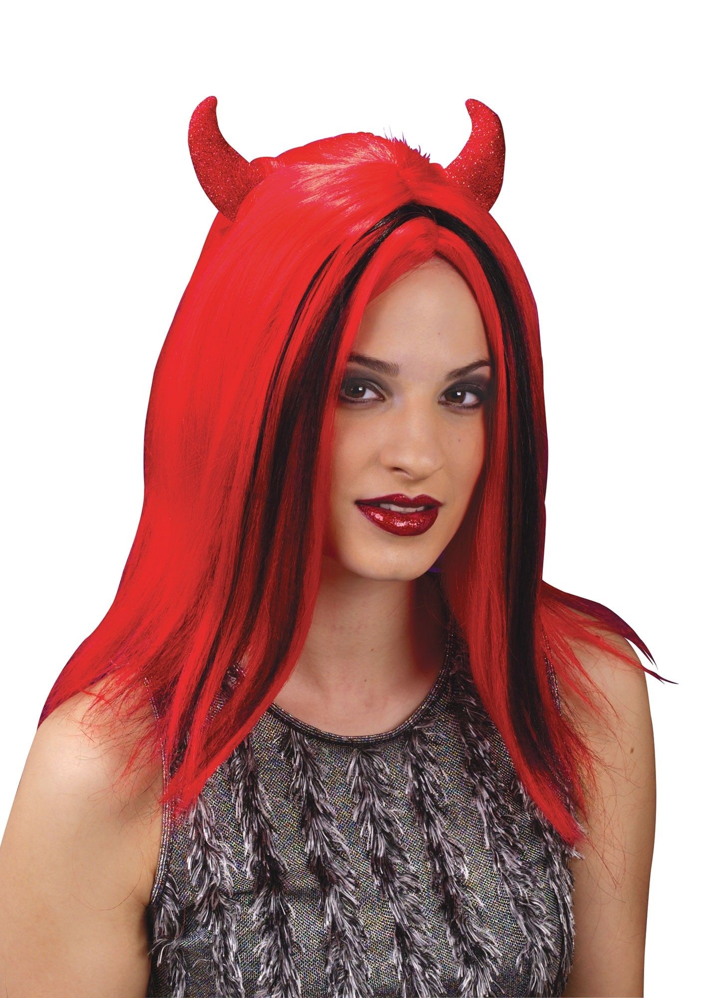 Парик дьяволицы с красными рожками - это парик прямых волос длиною около 45 см. Парик выполнен в красном цвете с черными прядями спереди. К парику прикреплены дьявольские красные рожки с блестками. Им можно дополнить костюмы дьяволиц, а также надеть отдельно в качестве аксессуара.