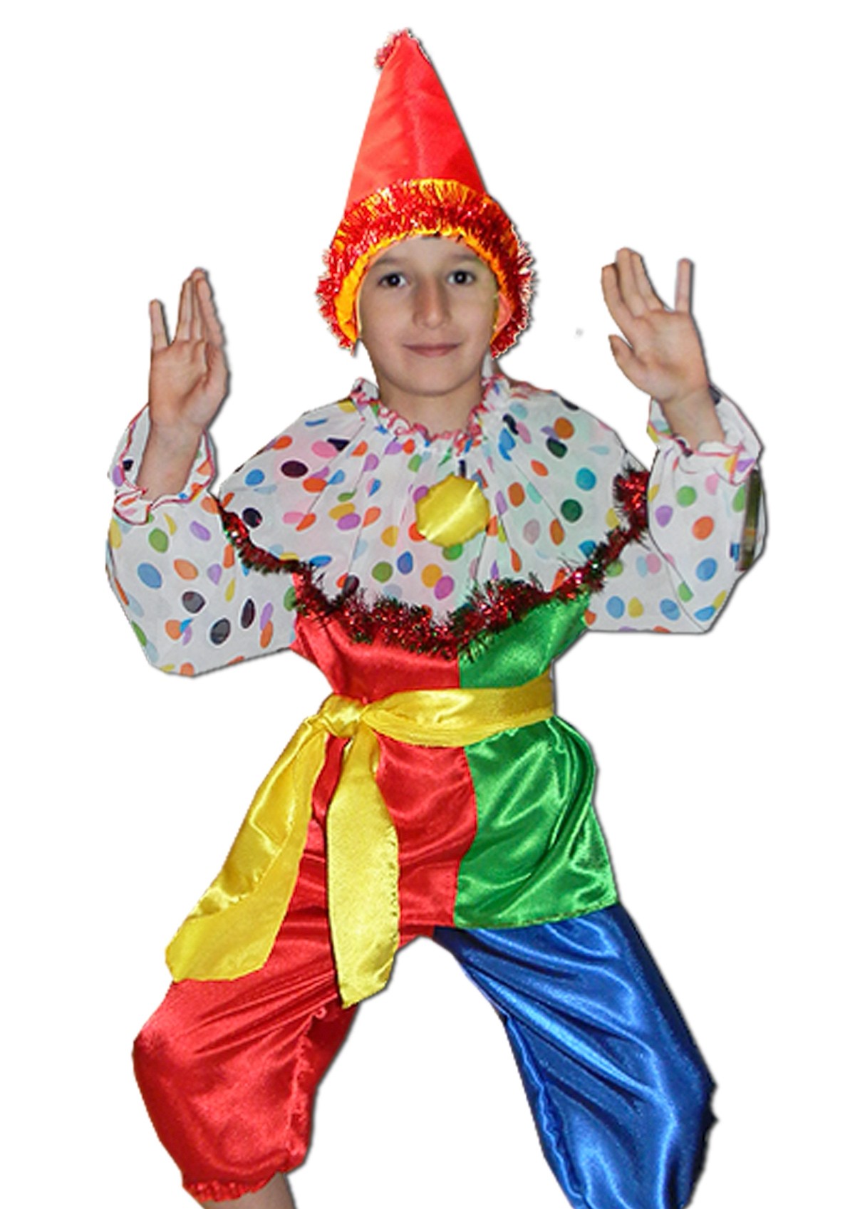Детский костюм Петрушки - яркий костюм из атласа, в комплект которого входит красный колпак, украшенный мишурой, разноцветная кофта с пестрым воротником в разноцветный горох и длинными рукавами в горох, также в костюм входят сине-красные штаны и желтый пояс.