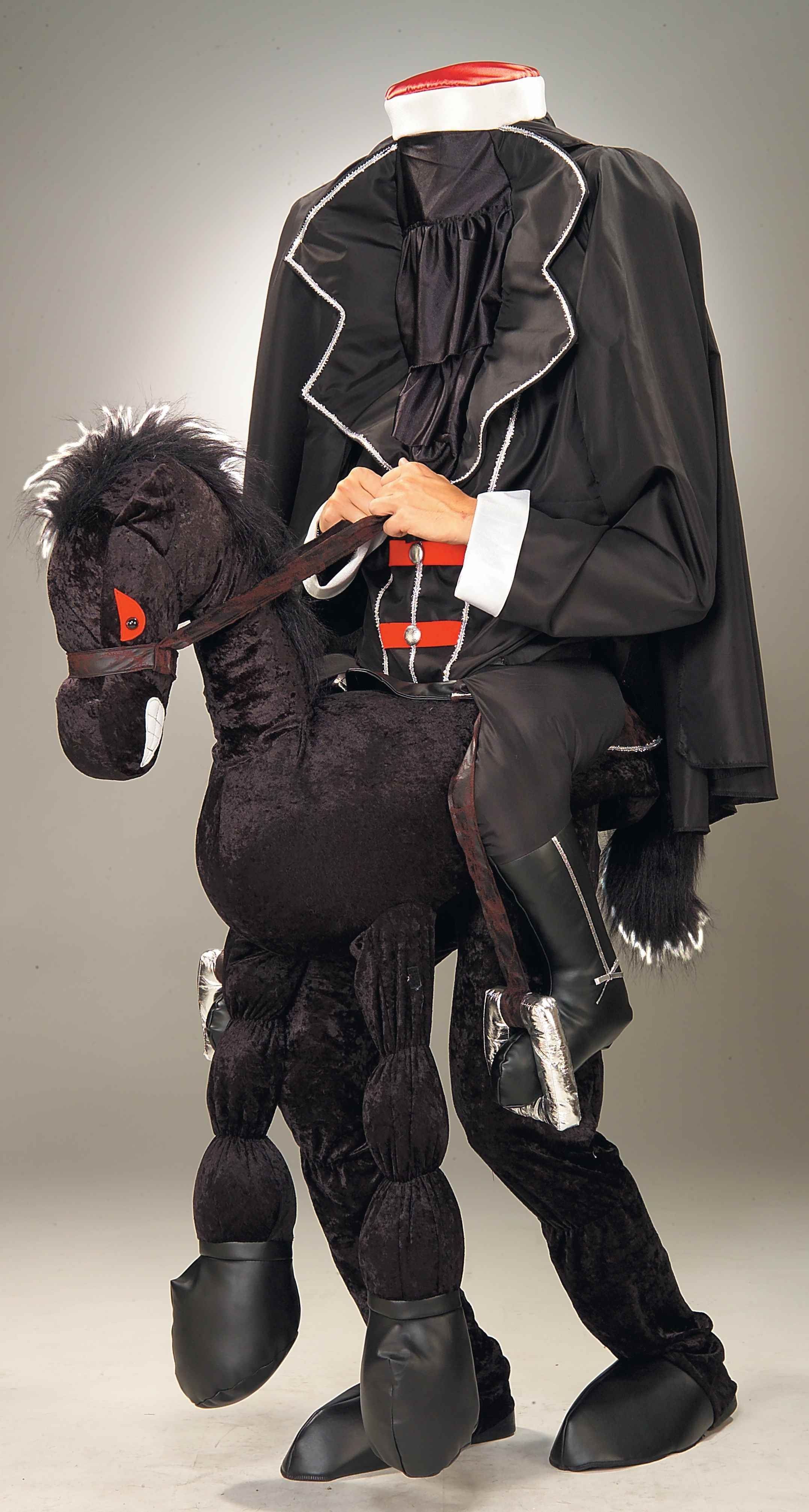 Костюм сумасшедшего всадника без головы состоит из накидки в виде плаща и брюк с прикрепленным чучелом лошади. Отрубленная часть головы надевается сверху как головной убор, а далее идет черная ткань, через которую вы можете видеть окружающих, а они вас нет. Вставленные в стремя ноги имитируют скачущего всадника. Ваши ноги вставляются в брюки и служат продолжением лошади. Скачите как можно быстрее на вечеринку, быть может вам удастся найти свою потерянную голову.