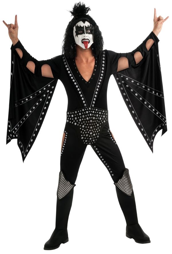 Черный костюм, который олицетворяет образ участника группы Kiss - Джина Симмонса. В костюм входит черный комбинезон с серыми точками и вырезами на бедрах и рукавах. К комбинезону прикреплены высокие накладки на сапоги. Также в комплект входит пояс и маска белого цвета с черными глазами и красным языком.