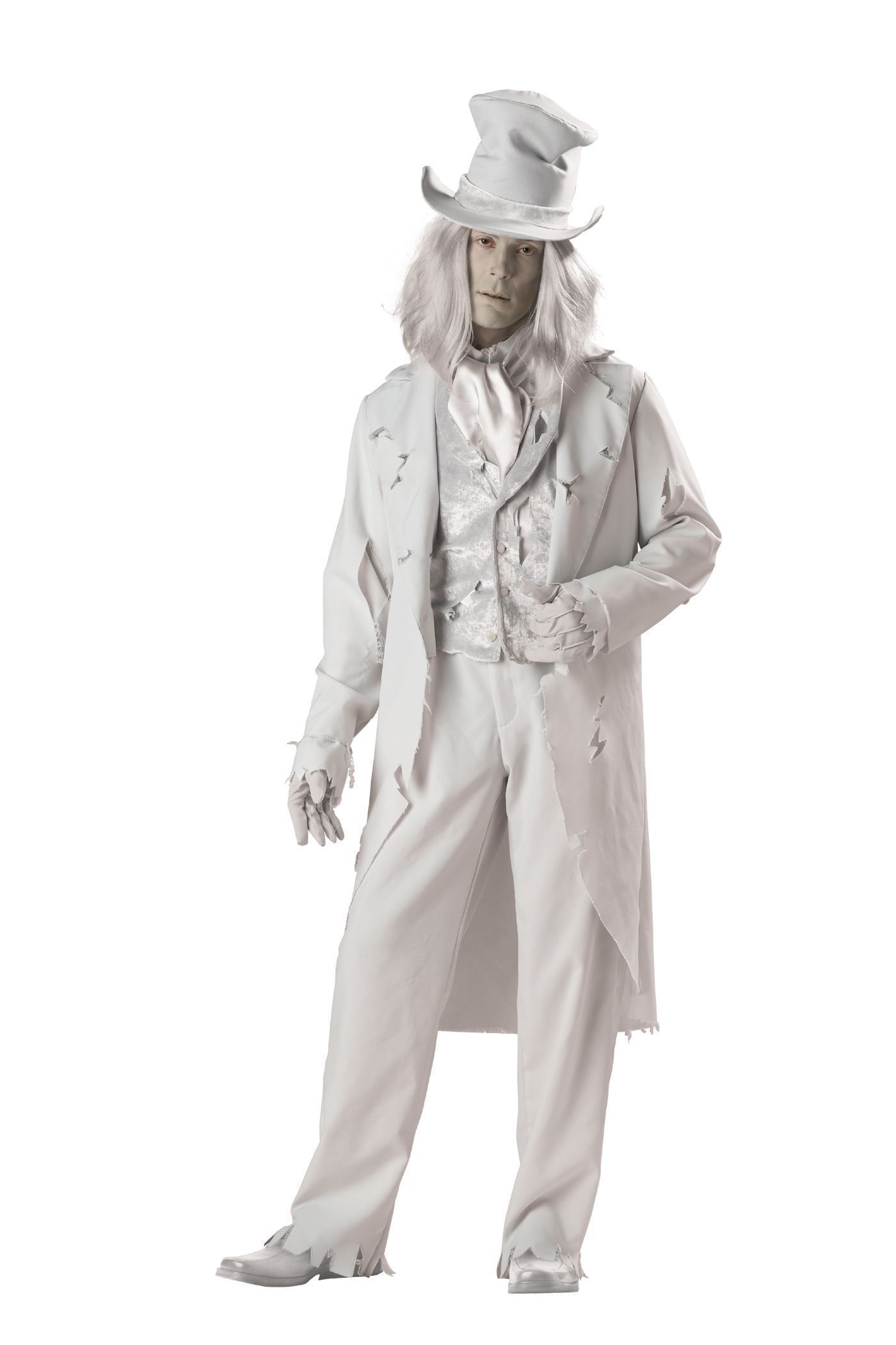 В костюм призрака входит: пальто , брюки, рубашка с пришитым жилетом, манишка с шарфом, шляпа, перчатки, парик.