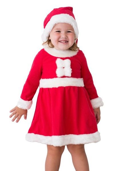 Костюм маленькой внучки Санты - это плюшевый теплый костюм, который включает в себя платье красного цвета с белой меховой отделкой, а также колпак с белым отворотом.