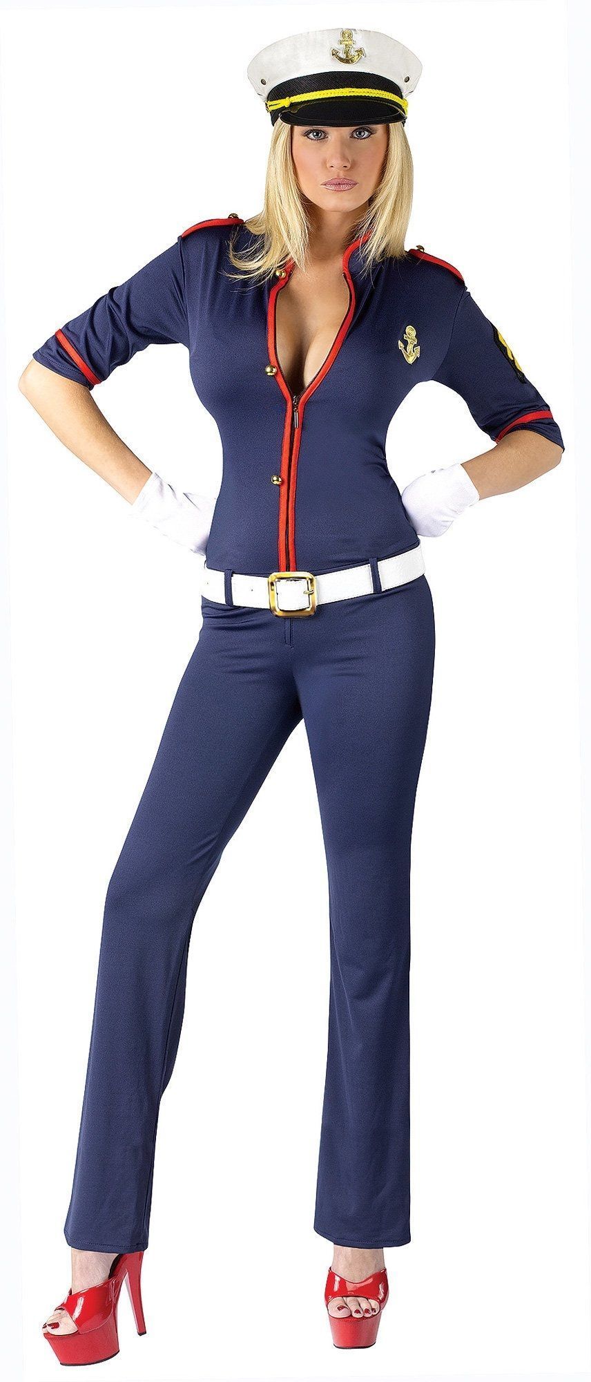 Костюм девушки адмирала покажет кто повелитель вечеринокна вашем корабле.Костюм включает в себя стретчевое обмундирование с застежками имолнией, белый пояс и фуражку.
