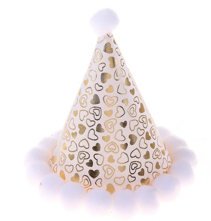 Колпак Золотистые сердечки с белыми пампушками поможет Вам создать веселый образ для любого праздника.