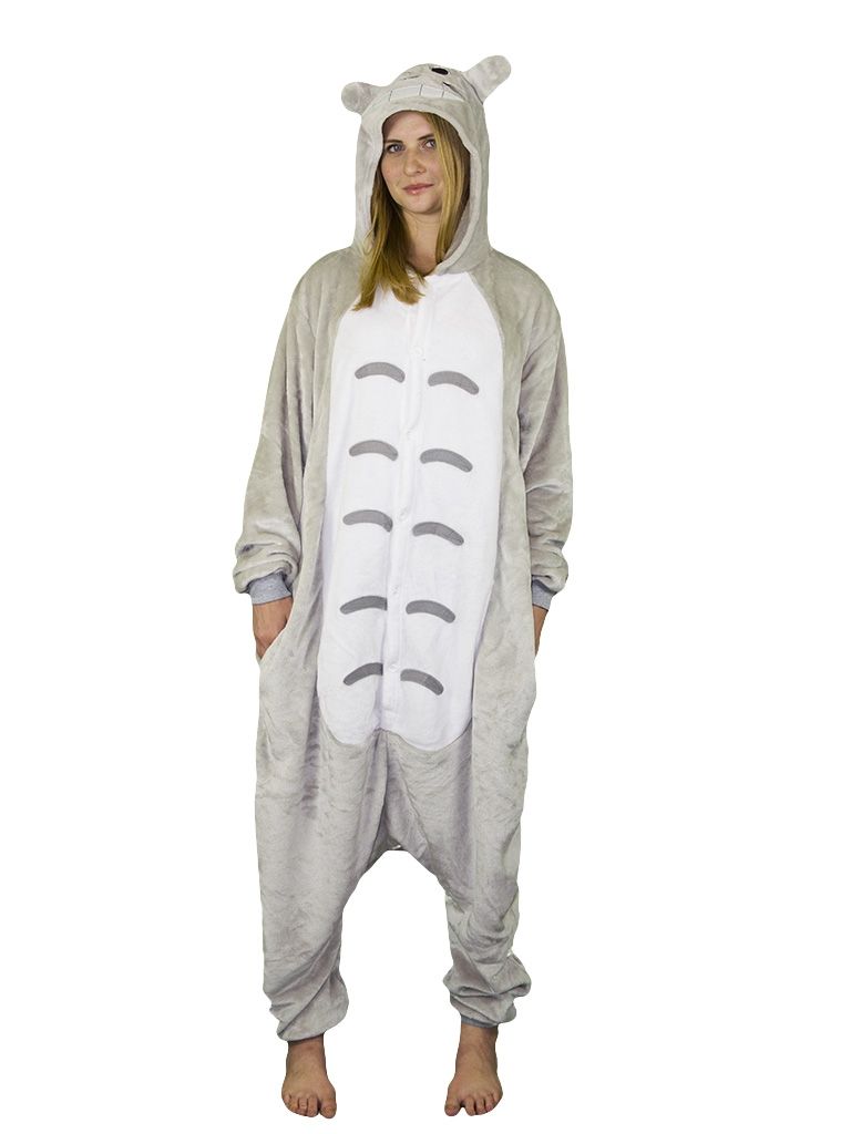 Пижама-кигуруми Тоторо, героя японского аниме, представляет собой комбинезон, который застегивается спереди на пуговицы. Капюшон комбинезона декорирован мордочкой героя мультфильма. Обувь в комплектацию не включена.