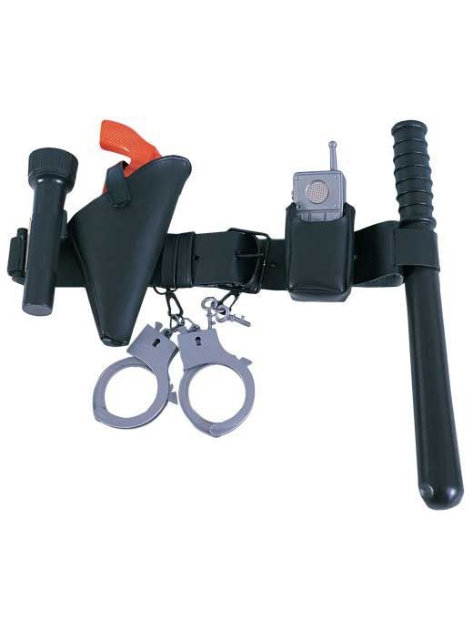Детский ремень полицейского - это черный виниловый ремень с серым телефоном, дубинкой, наручниками и ключами, пистолетом, а также фонариком (требуется две AA батарейки, в комплект НЕ входят).