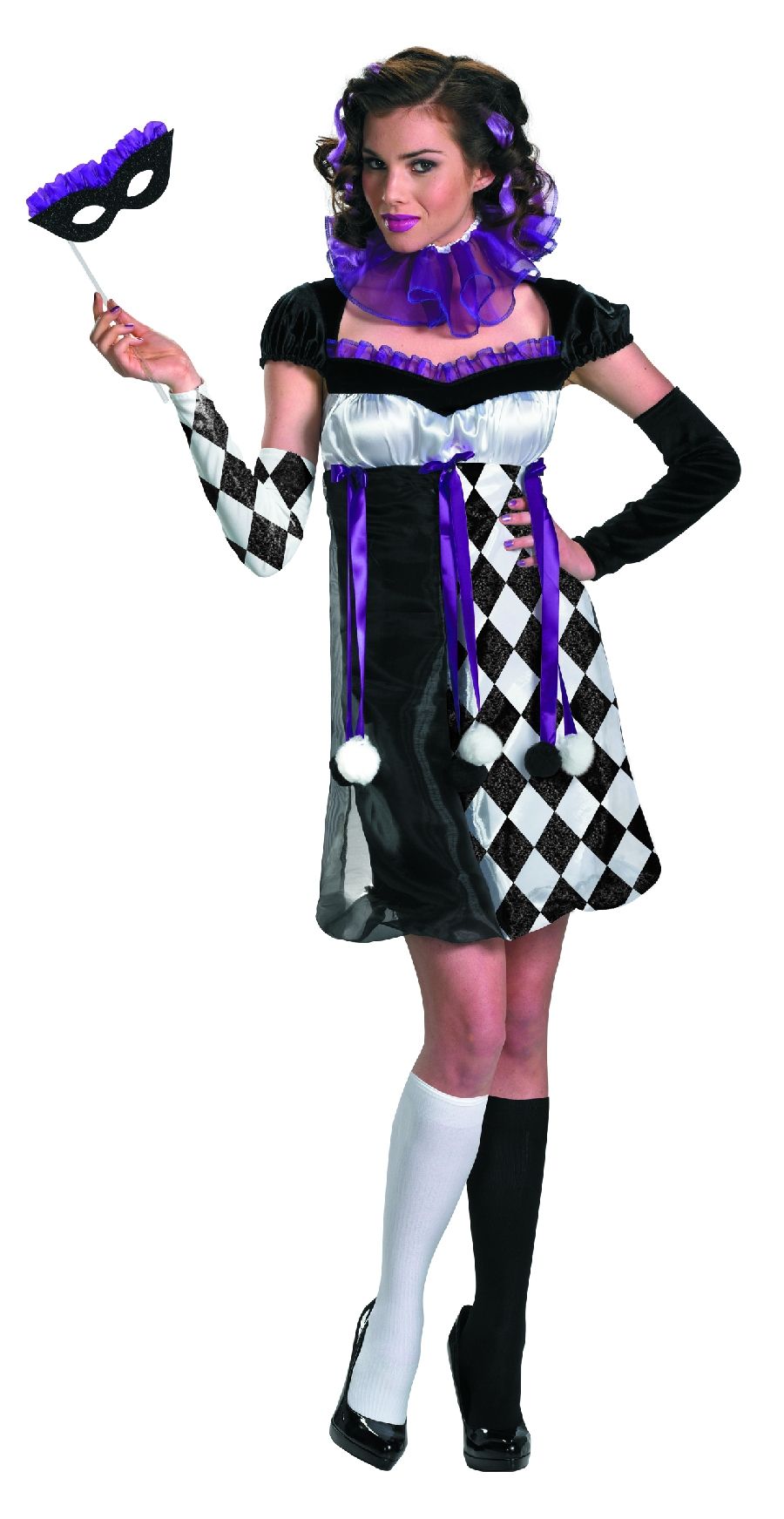 Маскарадный костюм Арлекино прекрасно подойдёт для маскарадов и карнавалов. В комплект костюма входит чёрно-белое платье, отдельный воротник, перчатки и маска на палочке. Чулки вы можете приобрести отдельно.