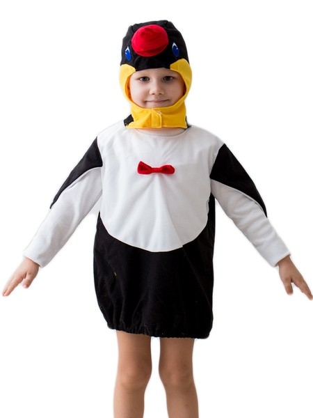 Детский костюм пингвина включает в себя черно-белый балахон, украшенный красным бантиком на груди, а также шапочку-маску в виде мордочки пингвина, которая застегивается на липучку на шее. Также комплект дополняет накладной набивной живот.