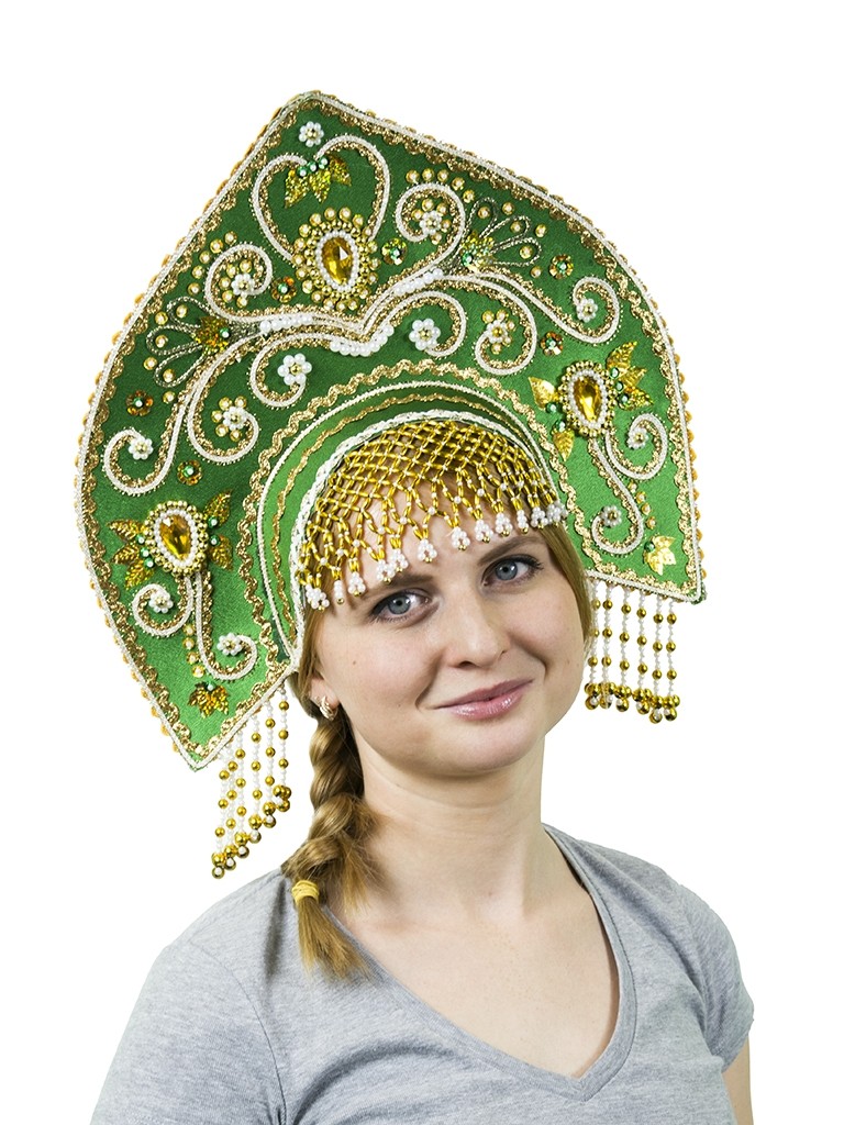 Зеленый кокошник Купола - изящный кокошник зеленого цвета, выполненный из атласного материала. Кокошник украшают аппликации и узоры из тесьмы и пайеток, а также из золотистых и белых бусин.