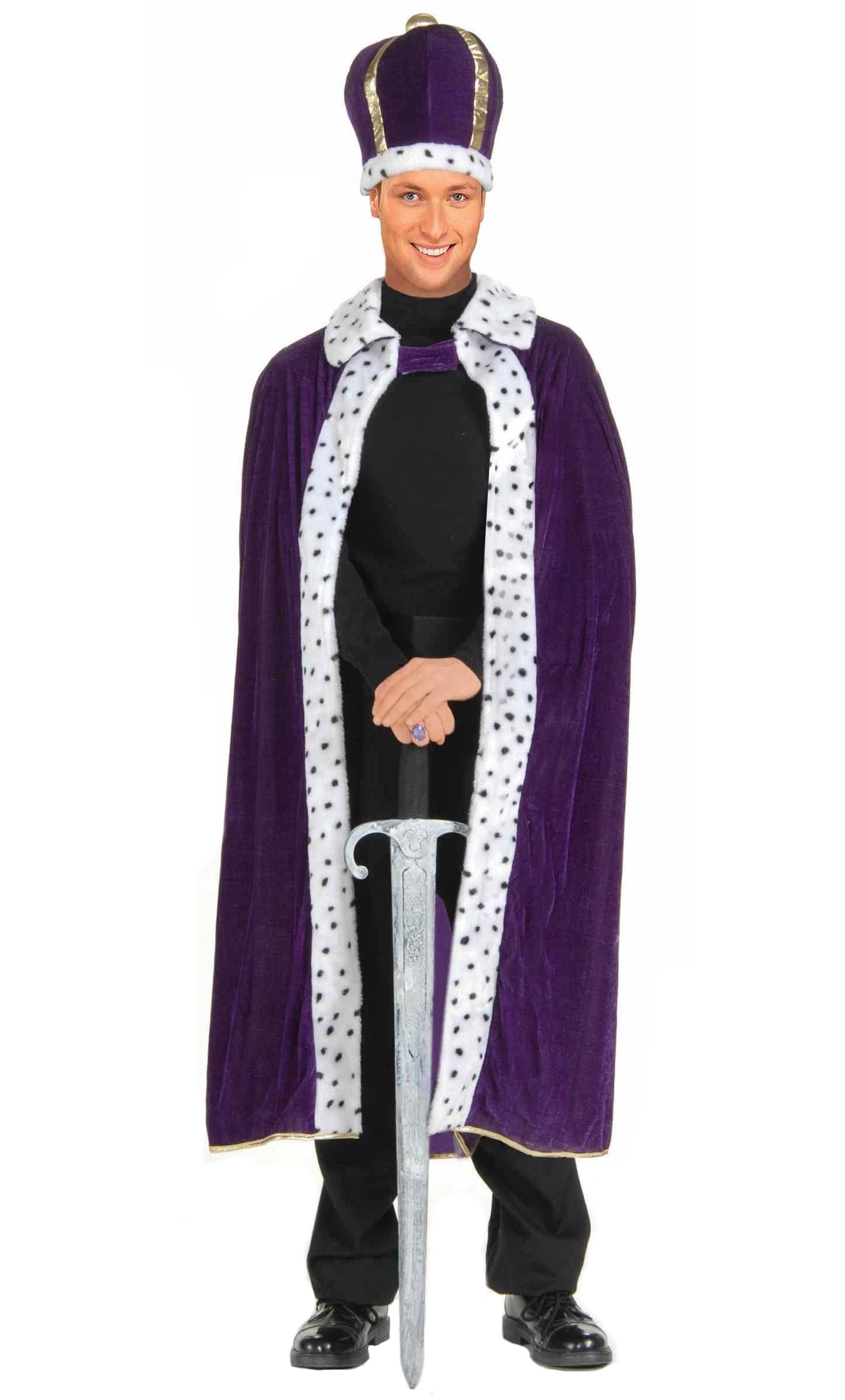 Королевский фиолетовый набор включает в себя фиолетовую длинную накидку-плащ с белой меховой отделкой и высокую королевскую шапку с меховой отделкой белого цвета. Меч в комплект не входит, но его можно приобрести отдельно, а также другие аксессуары.