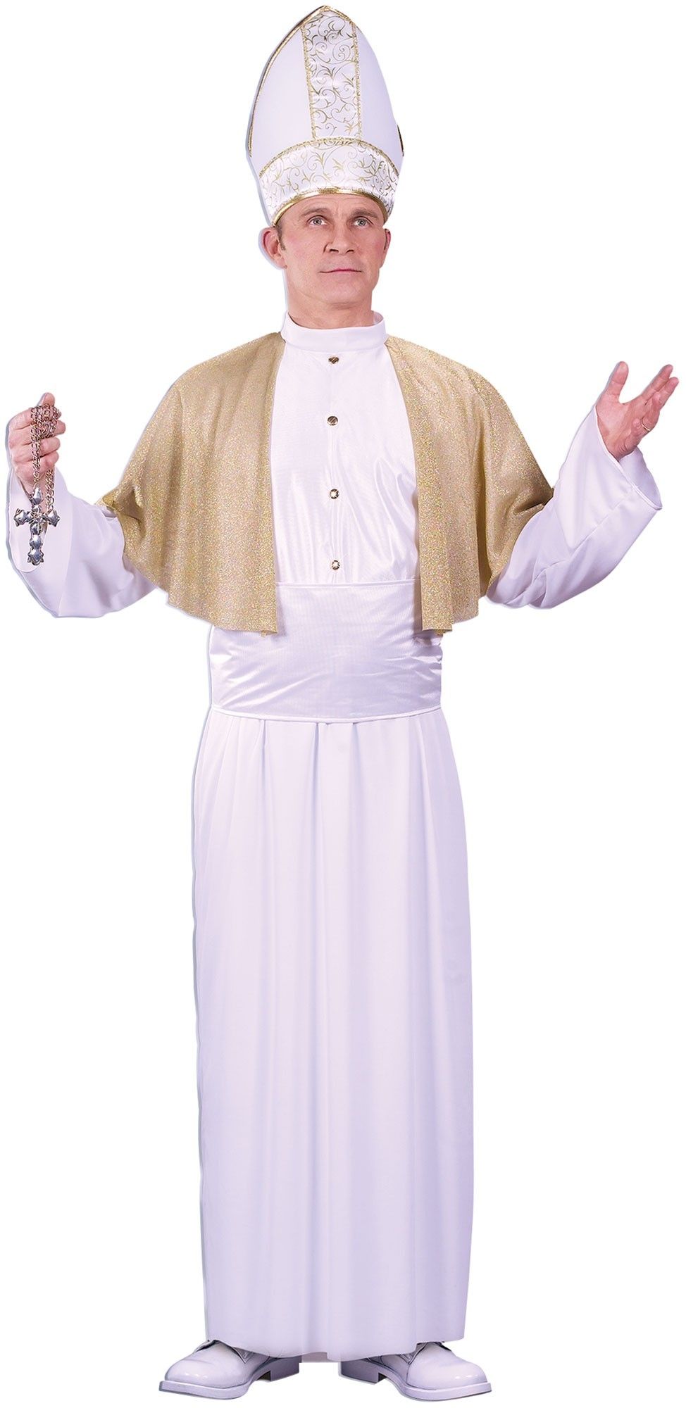 Белый костюм первосвященника включает в себя белое длинное одеяние с пуговицами на груди. к нему прилагается золотая короткая накидка на плечи, а также шапка-митра белого цвета с золотой отделкой.