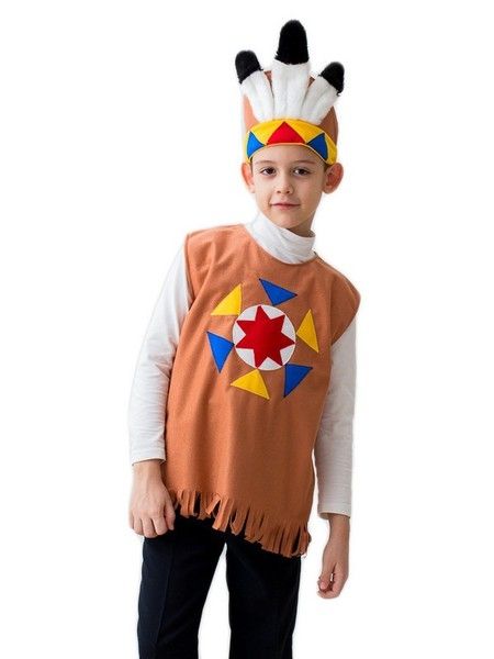 Костюм ребенка Индейца включает в себя яркую шапку индейца, украшенную перьями, а также коричневую безрукавку с узорами и бахромой на подоле.
