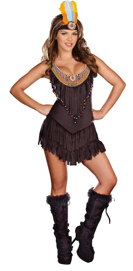 Костюм милой индейской девушки включает в себя коричневое платье в индейском стиле, украшенное бахромой и бисером, а также головной убор с пером. Этот костюм вы можете надеть на Новогодние вечеринки, выступления и маскарады. В этом наряде вы будете самой красивой индейской девушкой.