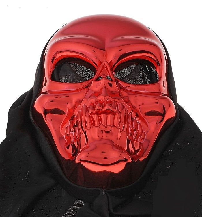 Красная маска улыбающегося черепа в черной накидке и огромными глазницами. Вы, словно, восставший из ада злодей, который с насмешкой смотрит на окружающих. Маска сделана из пластика, накидка из ткани. Размер маски 5х17х26 см.