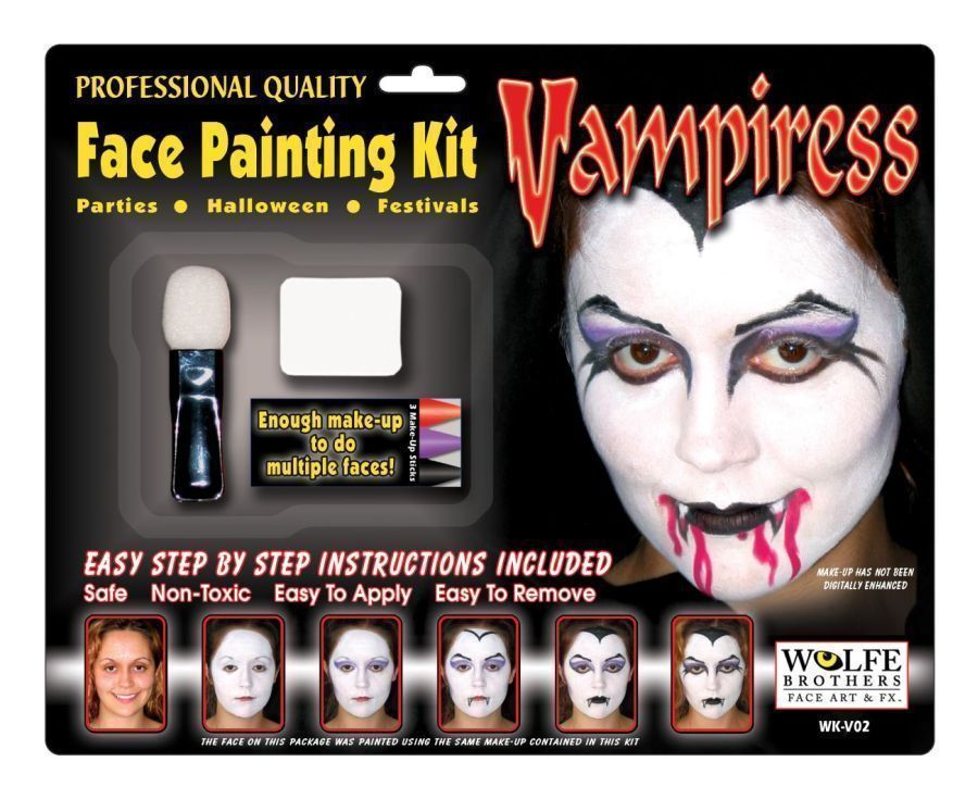 Набор для вампирского грима включает в себя белую крем-пудру, три карандаша и губку, также прилагается пошаговая инструкция. С таким набором вы сможете создать неповторимый образ вампира.