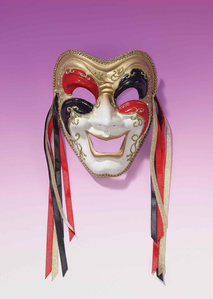 Разноцветная маска комедия - это маска на все лицо, выполненная в белом, золотом, красном и черном цветах. По бокам маска украшена разноцветными свисающими атласными ленточками.