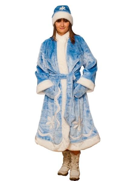 Плюшевый костюм Снегурочки выполнен в бело-голубом цвете. В комплект входит длинная шуба голубого цвета с белыми узорами, к ней прилагается пояс, меховая шапка с белым отворотом, а также меховые голубые варежки.