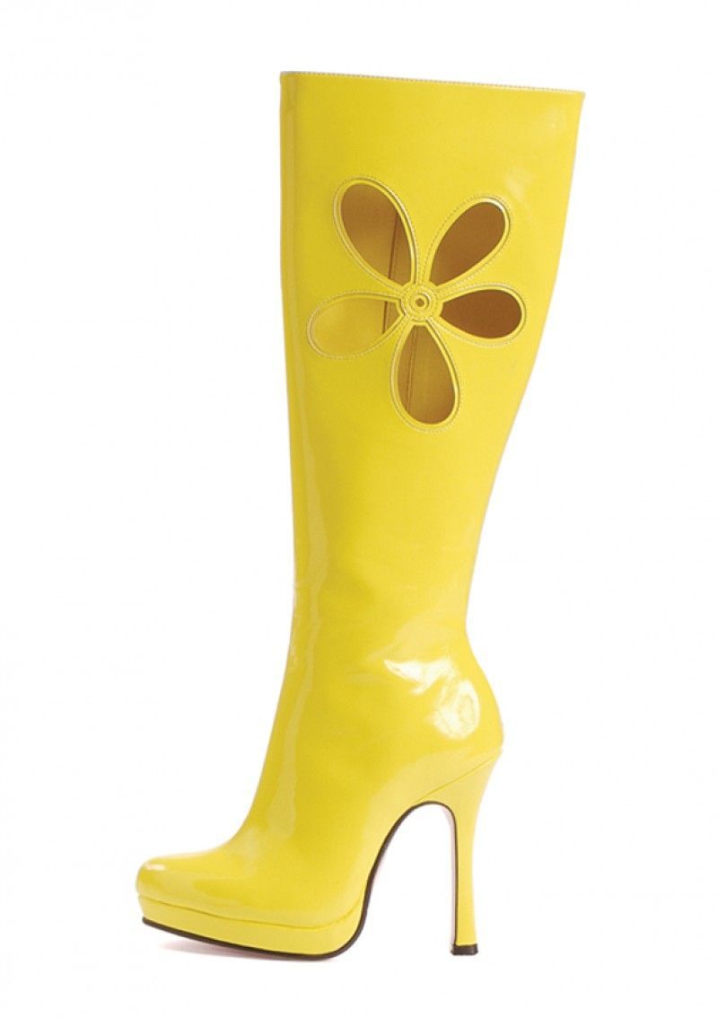 Желтые сапоги для танцев выполнены из блестящего ярко-желтого материала. Сбоку имеется вырез в виде цветочка. Высота каблука около 12 см.