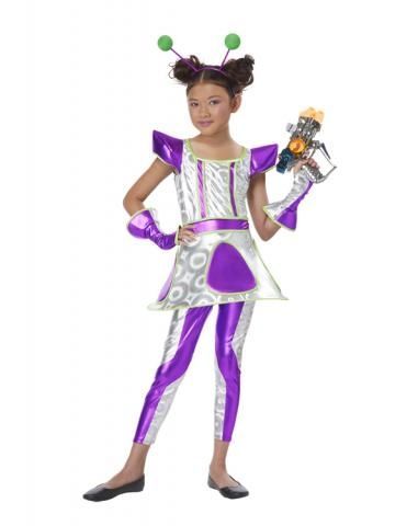 Костюм космического агента для любителей фантастических фильмов о космосе и пришельцах из других миров. Комплект включает в себя платье металлического цвета с фиолетовыми вставками, длинные леггинсы, перчатки и антенки. Будем надеется, что этот посланец пришел к нам на Землю с добрыми намерениями.