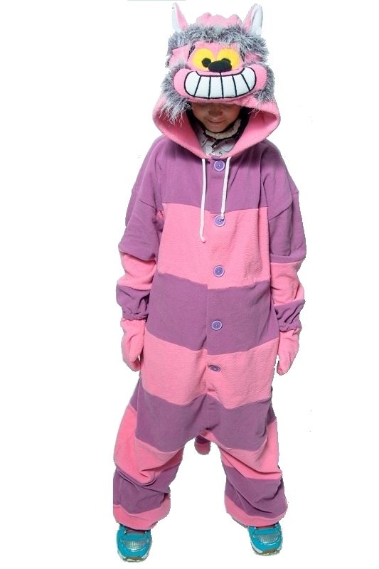 Кигуруми Чеширского Кота - плюшевый полосатый комбинезон на пуговицах с капюшоном. Комбинезон выполнен в розово-фиолетовом цвете. Капюшон фиксируется при помощи белого шнурка. К рукавами крепятся варежки. Комбинезон с двумя внутренними карманами. Кигуруми можно надевать на горнолыжные костюмы и прочую верхнюю одежду.