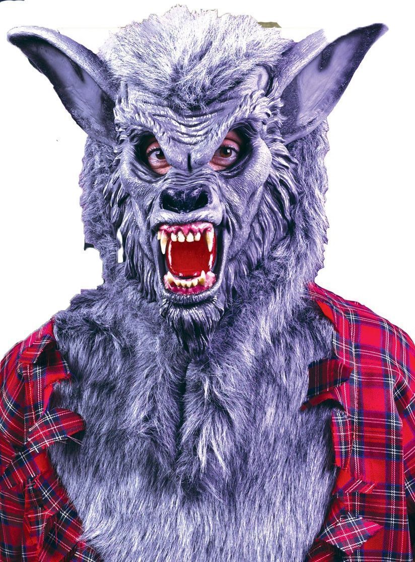 Маска серого оборотня выполнена из искусственного серого меха и латекса, открытый рот со слегка пожелтевшими клыками, чёрный нос, имеются отверстия для глаз. Маска одевается на голову и часть груди. Удобна в носке и не создаёт дискомфорта. Маска оборотня выражает сильную злость.