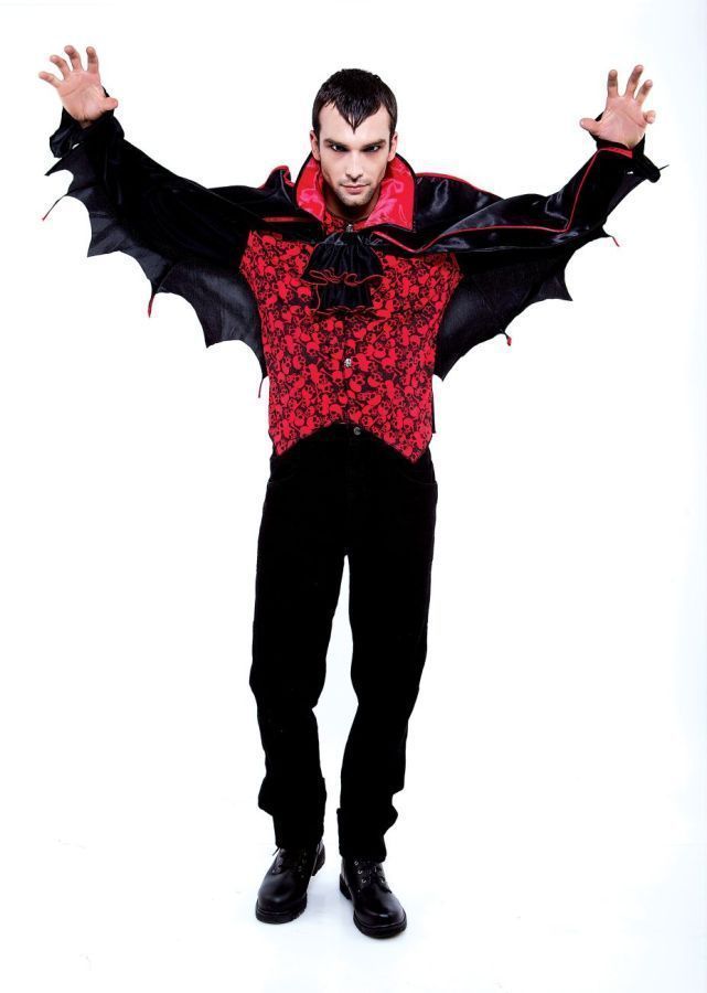 Мужской костюм летучей мыши включает в себя чёрную рубашку с прикреплённым жилетом с черепами и костями, крылья летучей мыши и жабо. К костюму можно подобрать грим и другие аксессуары, которые дополнят ваш образ. Для Хэллоуина этот костюм будет весьма кстати.