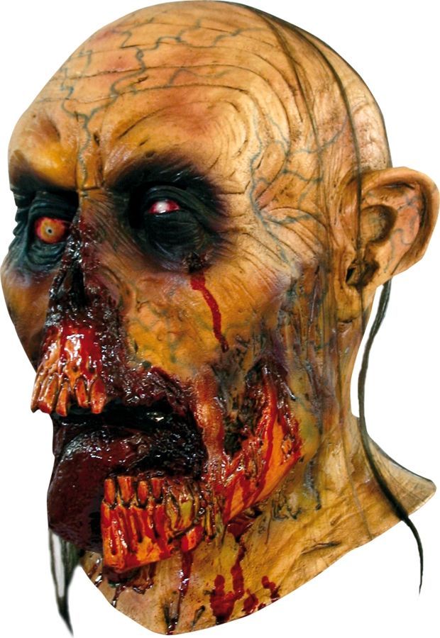 Маска зомби с разорванным ртом - это детализированная маска жуткого зомби с чёрными глазами, разорванным ртом и языком, выступающими венами и кровавыми ранами.