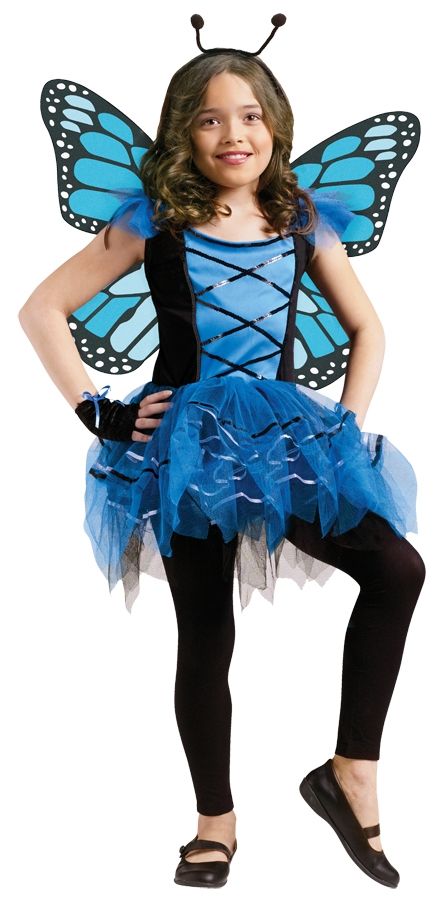 Детский синий костюм бабочки обязательно понравится вашему ребенку. В комплект входит: яркое синие платье с рисунком корсетной шнуровки спереди, черными вставками по бокам и пышной короткой юбочкой с бело-черной окантовкой, красивые крылышки, ободок с усиками и перчатки. Костюм можно надеть на маскарадную вечеринку, а платье на День рождение к друзьям.