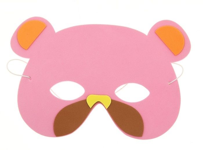 Маска медвежонка розовая с оранжевыми ушками. Маска сделана из мягкого пластика и имеет размер 22х15 см.