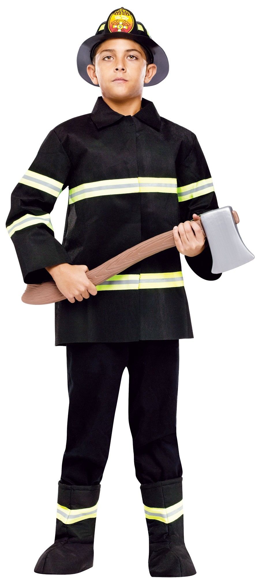 Детский костюм начальника пожарного включает в себя удлиненную черную курточку с желтыми светоотражающими полосками, пожарный шлем черного цвета с эмблемой и полосками, а также черные накладки на сапоги. Сзади на курточке имеется желтая надпись.