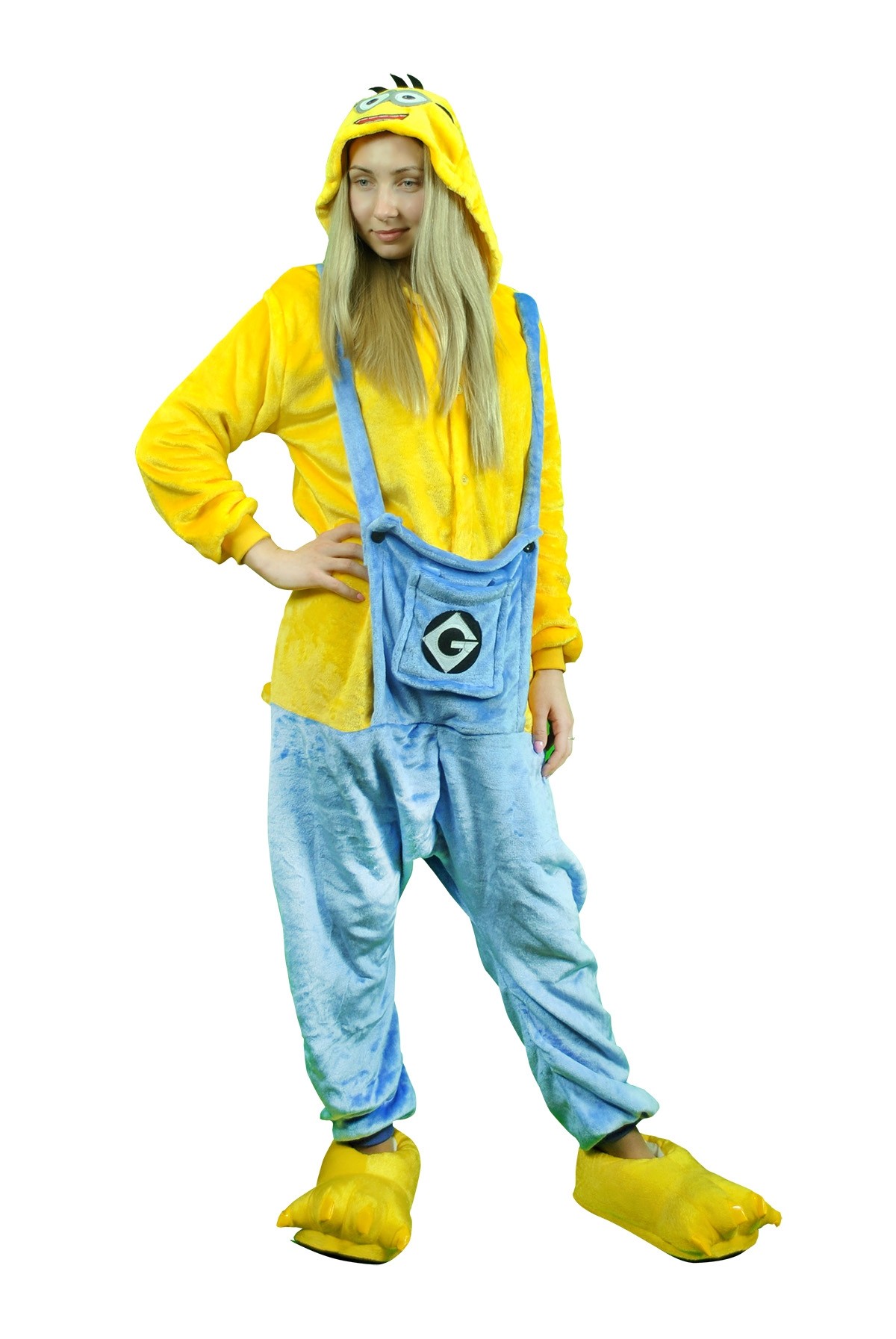 Кигуруми Миньон - яркая пижама, которая представляет собой образ забавного желтого человечка из мультфильма "Гадкий Я". Кигуруми с капюшоном, который выполнен в виде мордочки миньона. Кигуруми с имитацией голубого джинсового комбинезона.