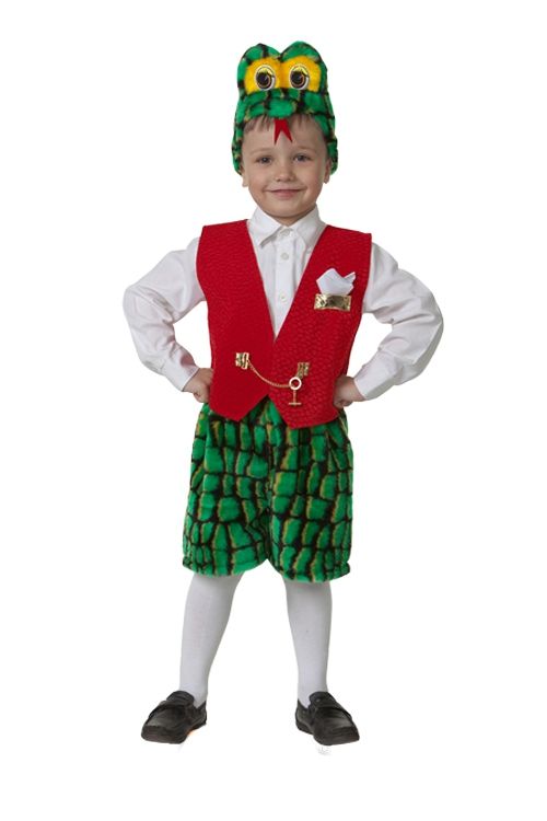 В комплект праздничного костюма входит красная жилетка с рисунком «змеиная кожа», с карманчиком для носового платочка и золотой застёжкой-цепочкой. Короткие шортики выполнены из качественного искусственного меха с рисунком под змеиную кожу. Завершает весёлый детский костюм оригинальный головной убор, имитирующий голову удавчика с глазками и язычком.