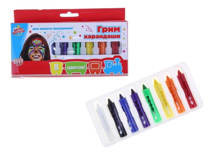 Карандаши для грима - это набор ярких красок-карандашей, предназначенных для нанесения грима как на лицо, так и на другие части тела. В комплекте 8 цветов.