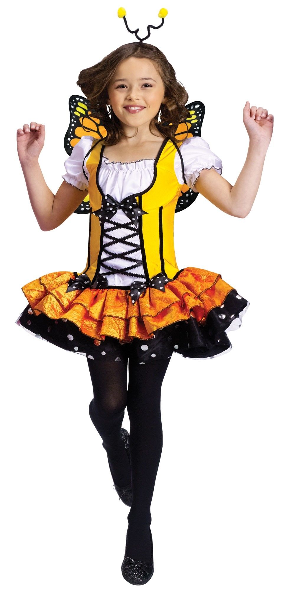 Костюм Бабочки Принцессы включает в себя яркое желто-оранжевое платье с пышной многослойной юбочкой. На груди черная шнуровка и бантик. К платью прилагаются атласные яркие узорчатые крылья и ободок с черными рожками.