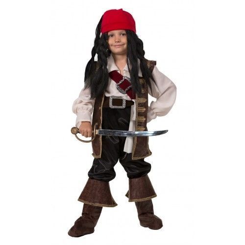 Костюм молодого Джека Воробья. В комплекте: рубашка, удлиненный жилет, штаны с пришитыми накладками на сапоги, меч, парик, бандана, 2 ремня, платок на ремень.