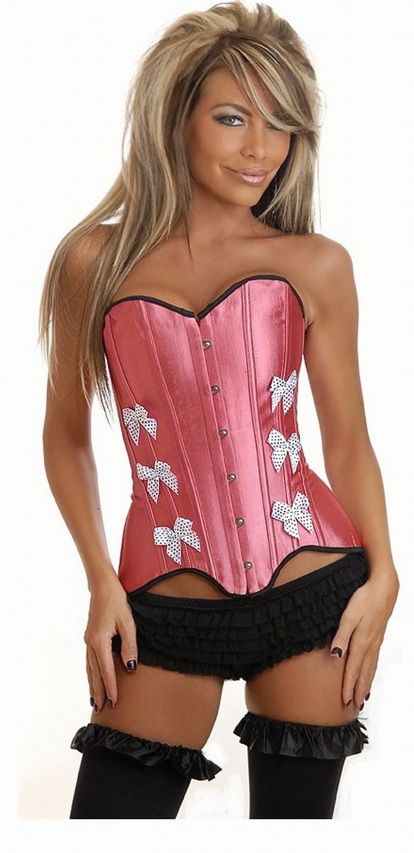 Розовый корсет с белыми бантами на застежках спереди и шнуровке сзади. В комплекте идут стринги. Корсет можно носить не только на вечеринки, но и в повседневной жизни с джинсами или юбкой.