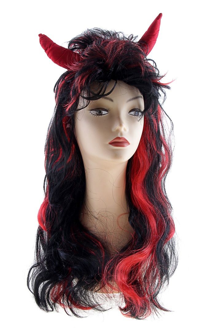 Длинный парик дьяволицы выполнен из черных и красных искусственных волос и украшен челкой и большими красными рогами. Им можно дополнить костюмы дьяволиц, а также надеть отдельно в качестве аксессуара.