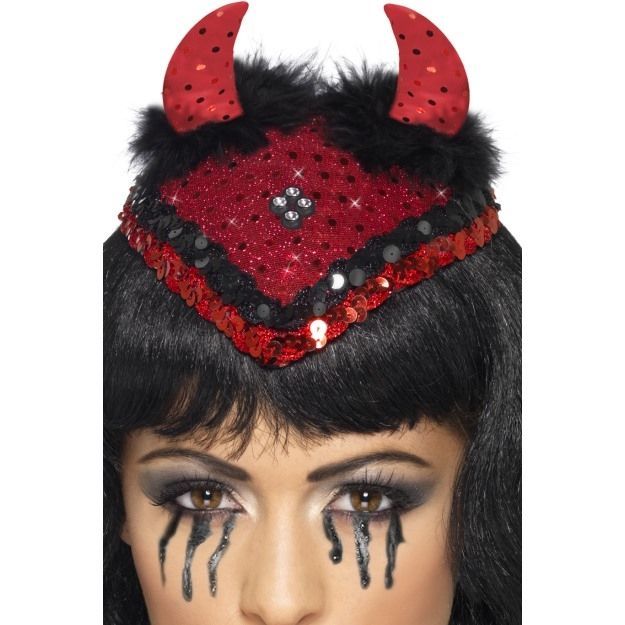 Мини-шляпка дьяволицы выполнена в красном цвете и украшена черными и красными пайетками. К шляпке прикреплены маленькие рожки с пайетками.